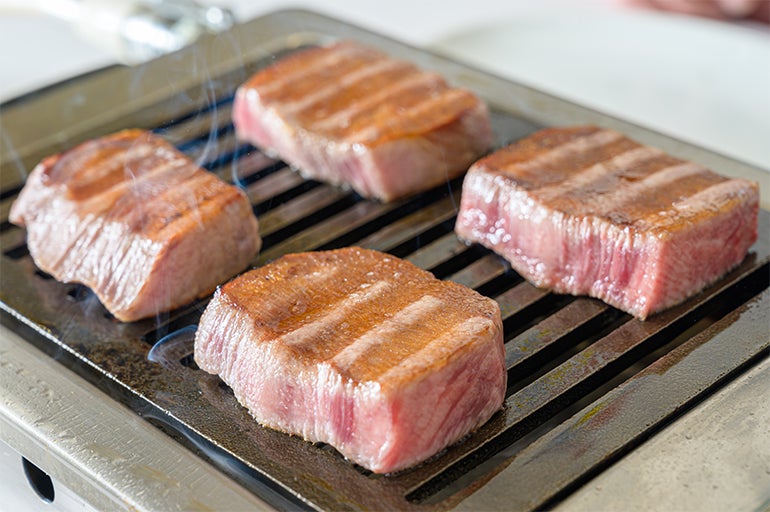 ひと噛みすれば、ザクッとした歯切れのよさで、口の中いっぱいに溢れだす肉汁。希少な和牛の、一番柔らかいタン元の部分を贅沢な分厚さでくり抜いているからこそ、この秀逸な味わいと食感を演出できています。