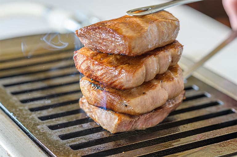 この厚切りタンは、じつは自分なりの焼き方があって、両側をパリッと焼き上げたら、積み上げてトングで挟むことで、サイドの面も焼くことが可能に。かなり肉厚なだけに、じっくり火を通す必要があるため、四方八方から熱を入れていくとムラなく焼きあがります。