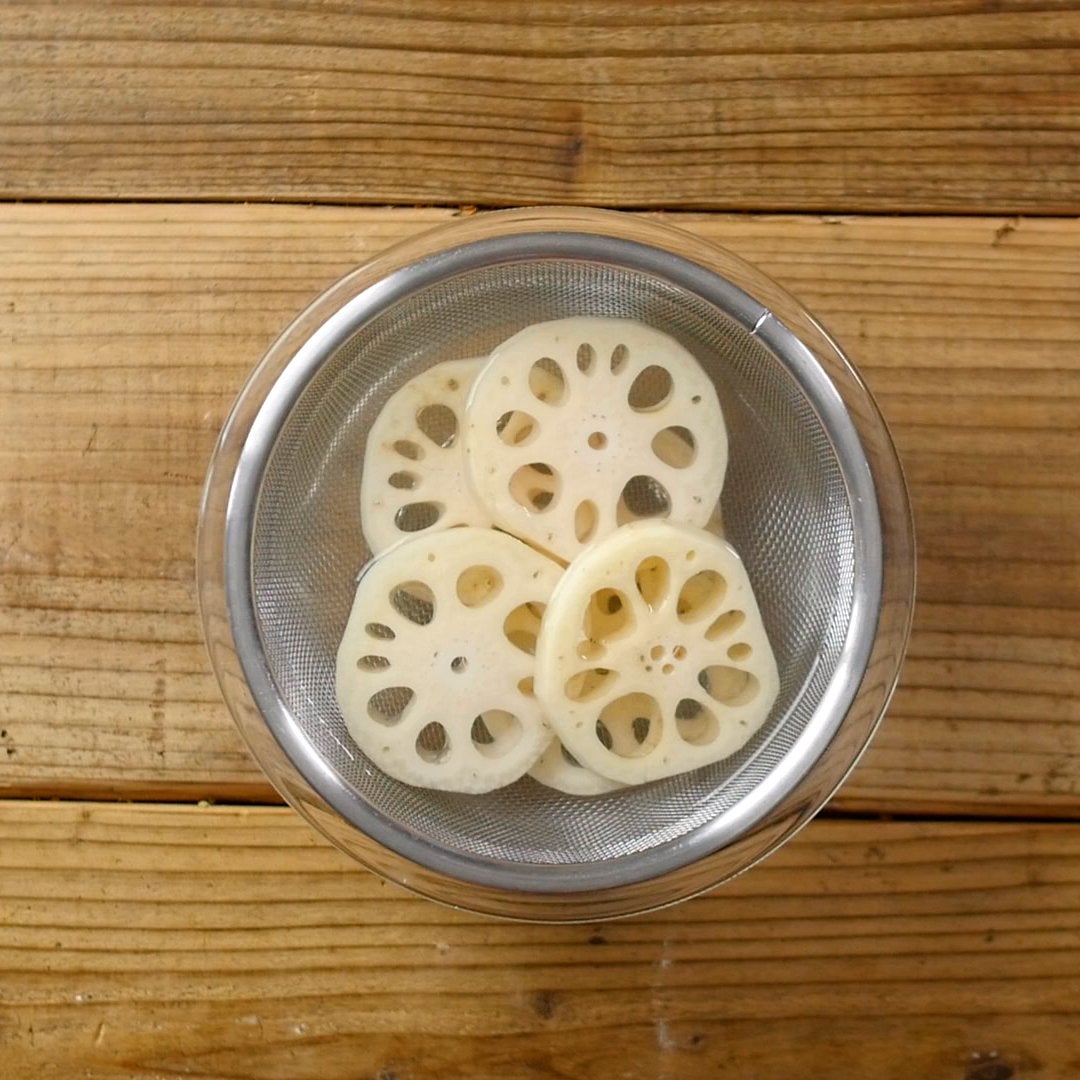 れんこんは1cm幅の輪切りにします。水にさらしてザルに上げ、ペーパーでしっかり水気をふき取ります。