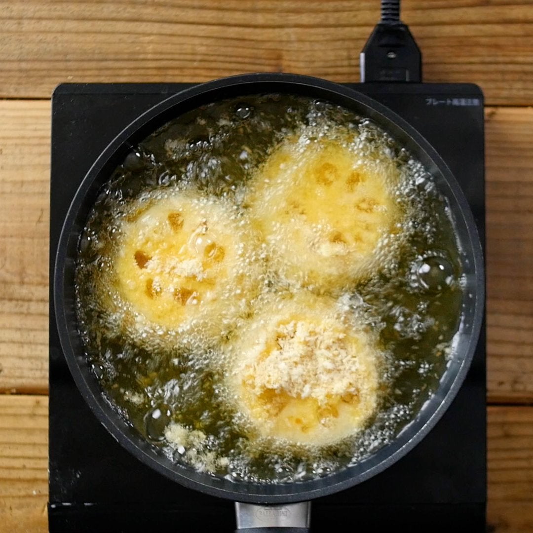 フライパンにサラダ油を入れて170℃に熱し、④をこんがりきつね色になるまで揚げたら完成です。
