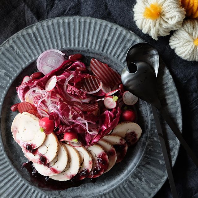 鶏ハムやトマト、紫玉ねぎなど全体的に赤やピンクの色で統一した盛り付け例です。