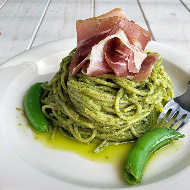 こちらのジェノベーゼパスタも、全体が緑色ソースに赤い生ハムがアクセントになり美味しそうに盛り付けできます。