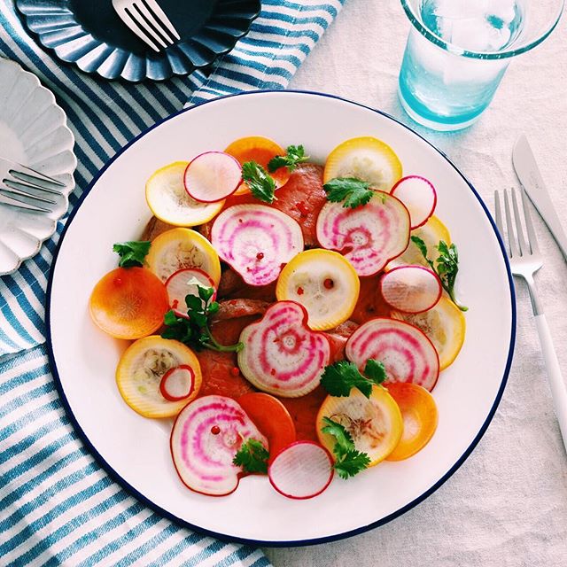 渦巻きビーツやズッキーニ、にんじん、ラディッシュなど少しずつ彩りの異なる野菜を合わせると料理に立体感が出て、美味しそうに見えます。