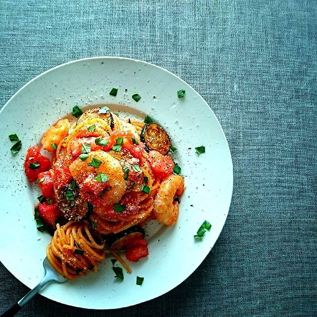 こちらの例のように、パスタをクルクルと巻きながら高さを出して盛り付け、具材を上に乗せると美味しそうに見えます。