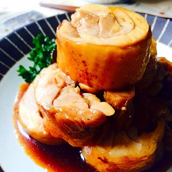 広げたもも肉を皮目を外にして巻いて紐で縛るか爪楊枝で留めてから、調味料を入れた煮汁で煮込みます。
