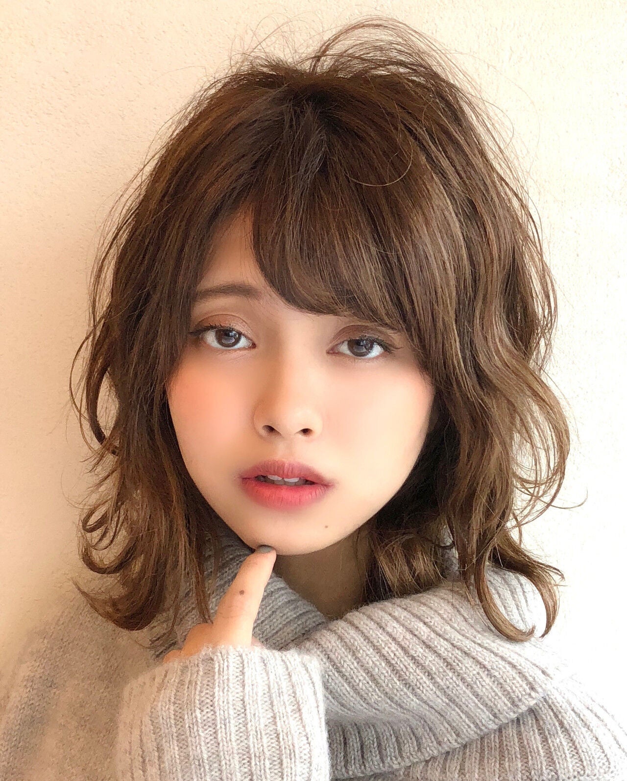 無造作にランダムカールをつくったゆるふわヘア。丸顔さんに似合うヘアスタイルです。ふんわりカールでフェイスラインを包みましょう。