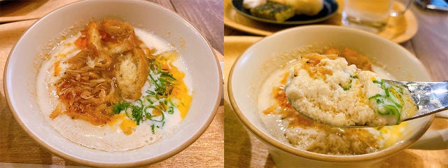 台湾人のお客さんに一番人気なのが、こちらも台湾の定番朝食メニュー「鹹豆漿(シェントウジャン)」。台湾風の塩味の豆乳スープで、ラー油のある・なしを選べる。汲み豆腐のようにとろとろの食感の豆乳に干しエビやザーサイ、ネギ、中国風揚げパンの油条(ヨウ ティァオ)などの薬味がからまり、まさに食べるスープ。滋味深い味わいで、ほど良い食べごたえもある。