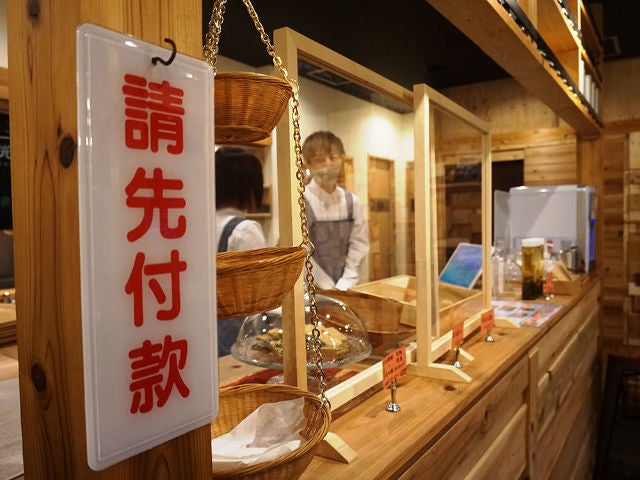 カウンターで注文し、番号札を渡されて席で名前を呼ばれるのを待つシステム。作りおきをしないため、焼きあがりのタイミングによっては20分ほど待つこともある。写真上、台湾から取り寄せたプレートに書かれている言葉は、「会計が先」という意味。