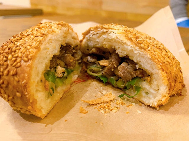 今、窯から出したばかりの焼きたてをさっそくいただく。2つに割って具が姿をあらわした瞬間、五香粉と胡椒の香りがパッと広がる。熱々をかぶりつくと表面の皮はパリッとしていて香ばしく、中はもちもち。ゴロゴロと大きめに切った肉からはスパイシーな肉汁があふれだし、胡椒のさわやかな香りが鼻に抜ける。これはやみつきになること間違いなしだ!
