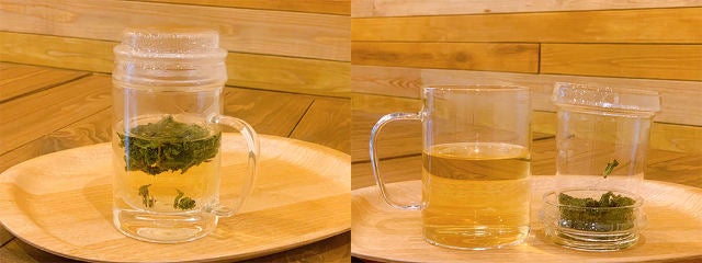 台湾茶で一番のおすすめは、ジャスミンや蘭(ラン)に似た華やかな香りと爽やかな味わいで日本人に人気の高い「翠玉茶(スイギョクチャ)」(写真上)。注文すると、蓋付きのガラスマグに茶葉を入れて渡してくれるので、カウンターの右端にある給湯器で自分でお湯を注ぐスタイルだ。蓋をして1~2分蒸らしたら、中の茶こしを取り出して蓋に置く。自分で何度でもお湯を注ぐことができるので、何杯でも好きなだけおかわりができるというメリットがある。