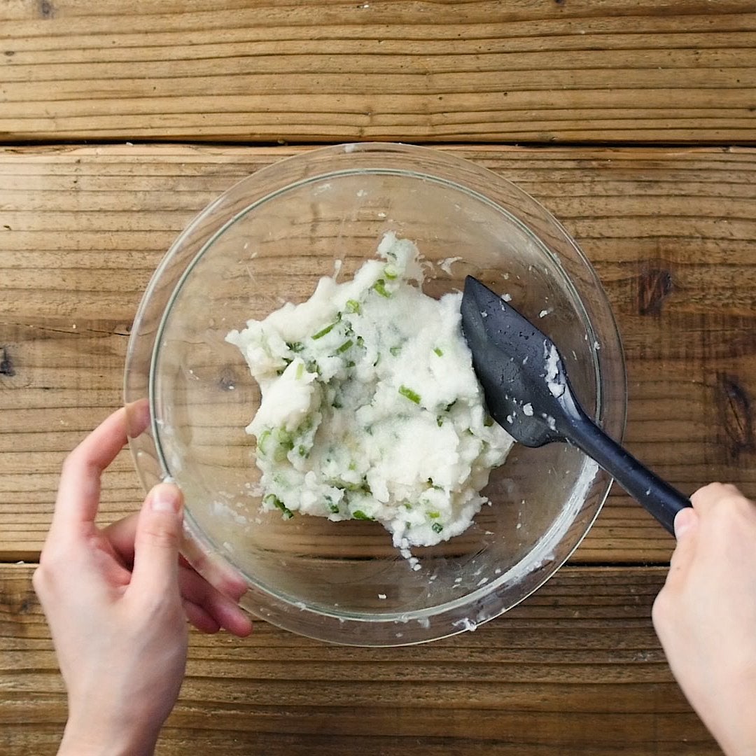 小口ねぎ、だしの素、塩、片栗粉を混ぜ合わせて1/6量ずつ手に取り、丸めます。