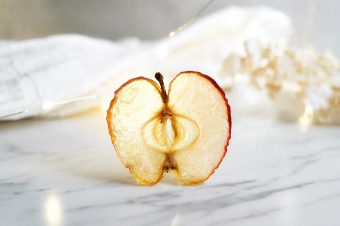 20分に1回くらいの頻度でりんごをひっくり返すのを繰り返し、水分が飛んだら完成!焦げないようにこまめにひっくり返すのがポイントです。また、オーブンから出したてのときは熱くてやわらかいので、チェックするときはひとつ取り出してしばらく常温で放置し、 “パリパリに乾燥しているか” 確認をします。ふにゃっとしているようであれば、追加でオーブンに入れ乾燥を続けましょう。