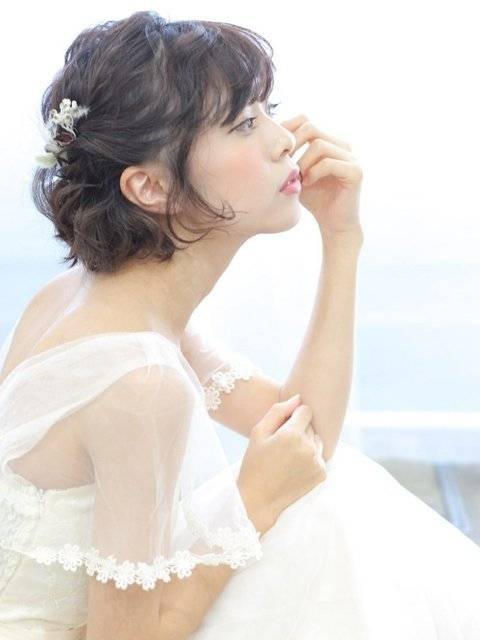 ゆる巻きのショートヘアをベースにし、耳を出したヘアセットはとても女性らしく仕上がります。