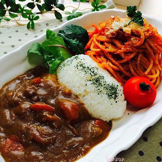 カレーとナポリタンを盛り合わせた、豪華なワンプレートメニューです。こちらの盛り付けのコツは、カレーとナポリタンの間にご飯を挟むこと。