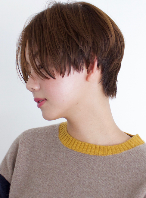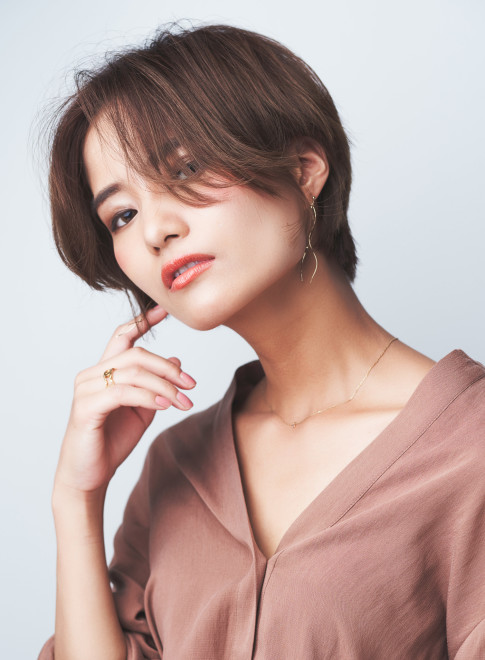 柔らかい質感に仕上げた、フェミニンなショートスタイルです。後頭部やトップはカットで動きとボリュームをプラス。襟足はやや長めに残し、首筋に沿うようにカットしています。