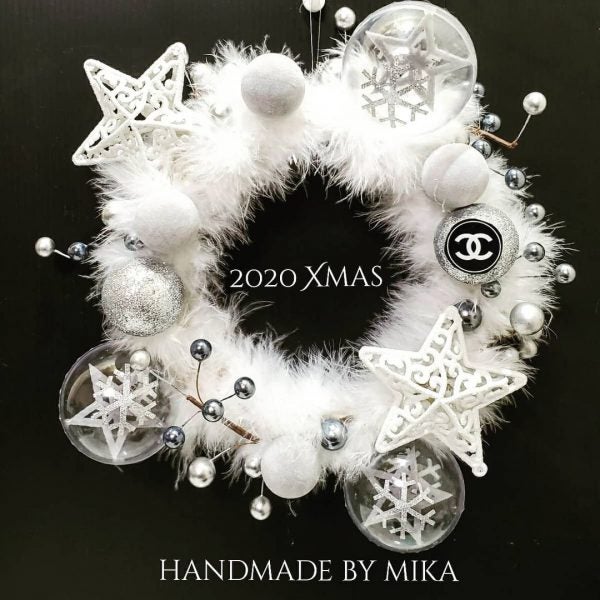 ホワイトを基調とした高級感抜群のリース。実は、セリアのアイテムを組み合わせて出来ています。