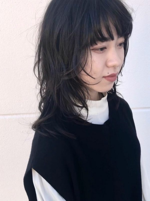 黒髪に近い暗めカラーで作ったストレートのミディアムウルフも、エアリーな印象にキマります。