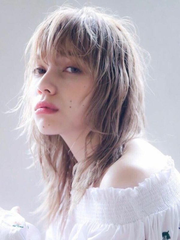 重めに仕上げた前髪ありのマッシュスタイルと、エアリーなウルフカットのコントラストで独特なヘアスタイルに仕上がります。