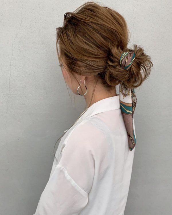 スカーフを使った前髪なし×お団子アレンジ