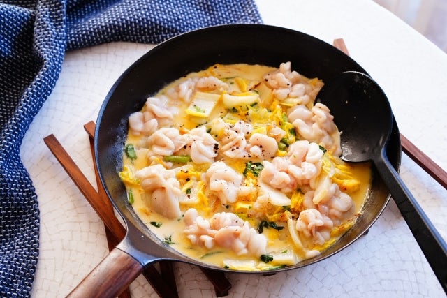 ② 白菜がしんなりしてきたら生クリームを入れてひと煮立ちさせ、白子を入れて塩胡椒をし、弱火で2分程煮込む。
