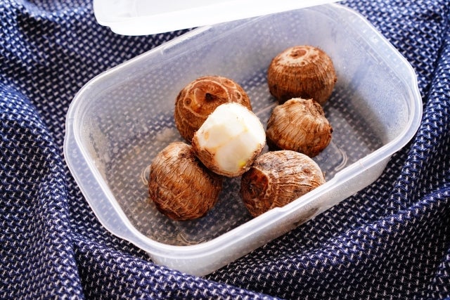 ① 里芋は皮のまま洗って耐熱容器に入れてふわっとラップをかけ、500wのレンジで4分加熱、取り出して皮を剥き適当な大きさにカットする。