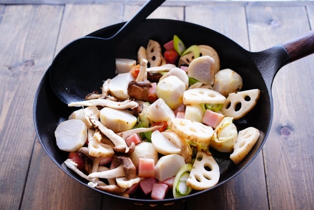 ④ フライパンにバターを入れて、カットしたベーコン・れんこん・白ネギ・ひらたけを入れてサッと炒めて塩胡椒をし、里芋を入れる。