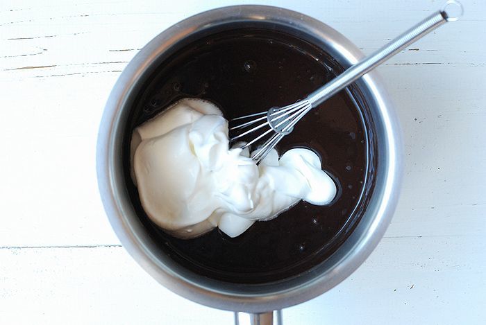 ④ チョコの液体に生クリームを3度に分けて加えゴムベラでよく混ぜる。