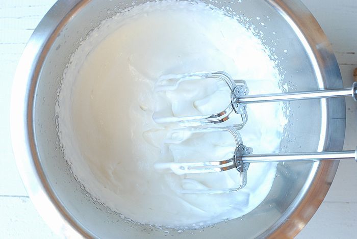 ➂ ボウルに生クリームと砂糖を入れボウルの底を氷水で冷やしながら泡立て器で7分立てに泡立てる。