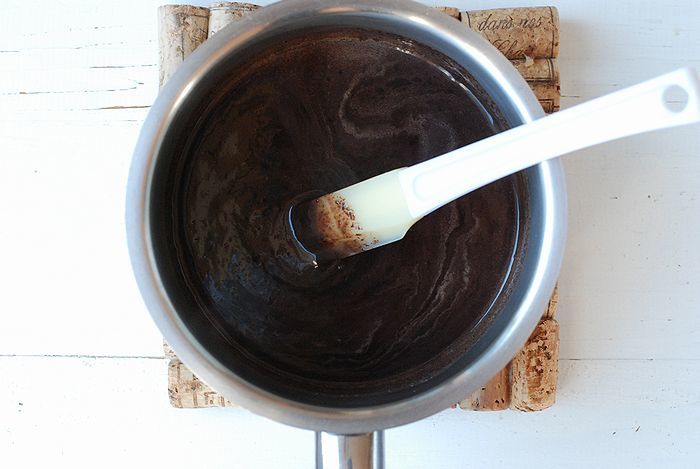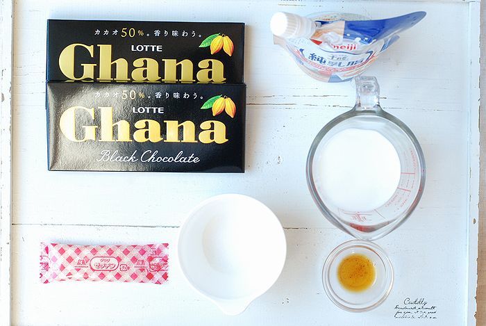 ① 小鍋に牛乳を入れ火にかける。沸騰直前で火を止め刻んだ板チョコを加えゴムベラで混ぜてよく溶かす。