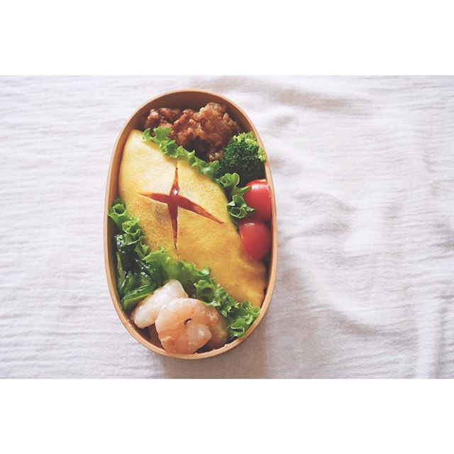 お弁当箱を斜めに使った詰め方なら、楕円形のオムライスも綺麗に仕上がりますよ。