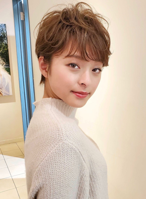 トップはふんわり、襟足はスッキリ、メリハリのあるフォルムが特徴的なベリーショートです。やや明るめのカラーリングで、ふわっとした質感を強調。直毛の方はパーマもおすすめですよ。
