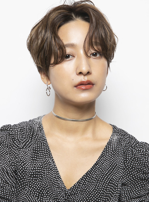 耳をスッキリと出した爽やかなスタイルです。毛先に柔らかい動きが出るようにカットしているので、ボーイッシュに傾きすぎません。カラーはオレンジ系で大人可愛い雰囲気をプラス。