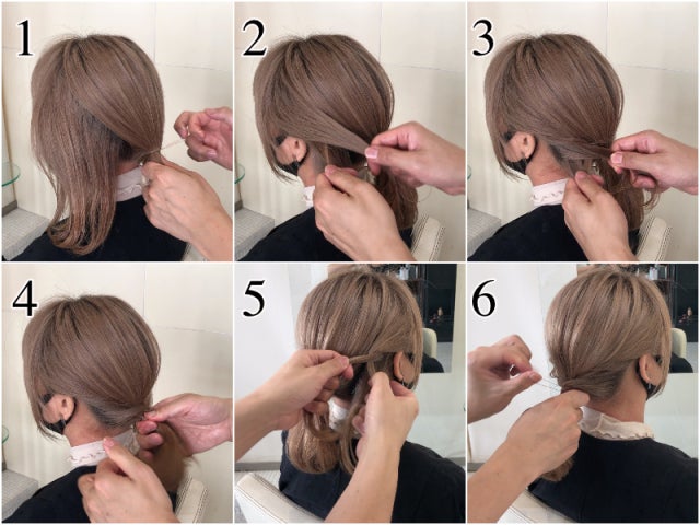 ②③④ 左サイドの髪の毛をツイストし、ゴム留めします。