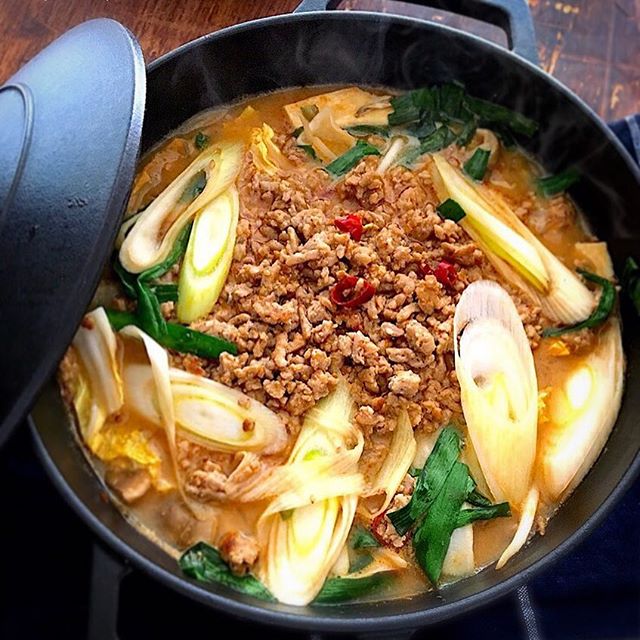 土鍋やStaubで作って熱々をいただくと良いですよ。鍋料理らしく、白菜やネギ、きのこなどの具材をたっぷり入れて作れば、栄養満点の食事なりそう。