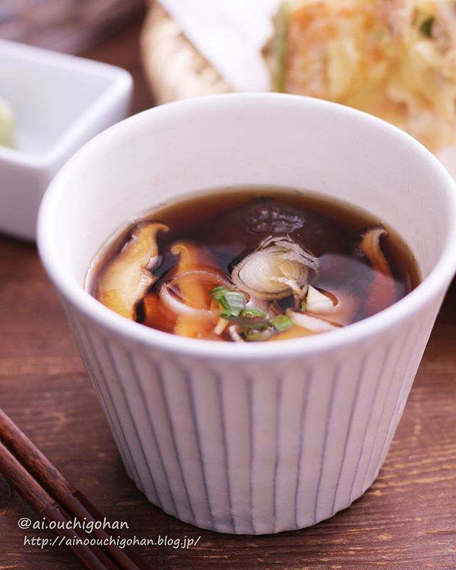 一度食べるとやみつきになり、また作りたくなる人気メニューに。温かいつゆに干し椎茸の薄切りが入っていて、心地良い食感も感じられます。