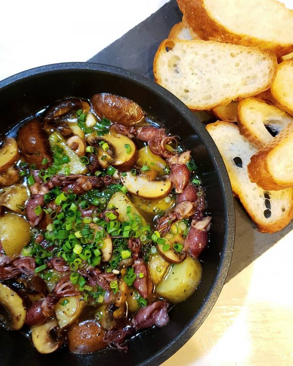 アヒージョはオリーブオイルで食材を煮込んだもので、オイルが熱い状態で食べるのがとっても美味しい料理。