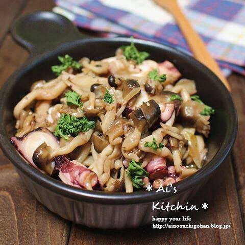 タコとしめじを炒めてガリバタ醤油で味付けしただけの簡単おつまみレシピがこちらです。