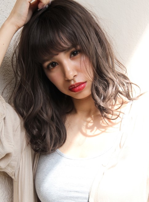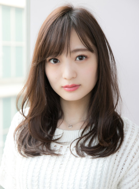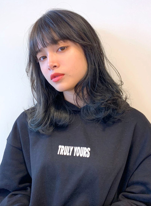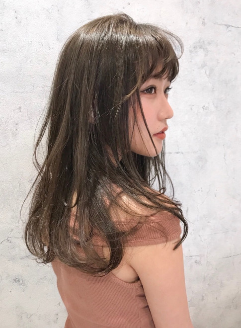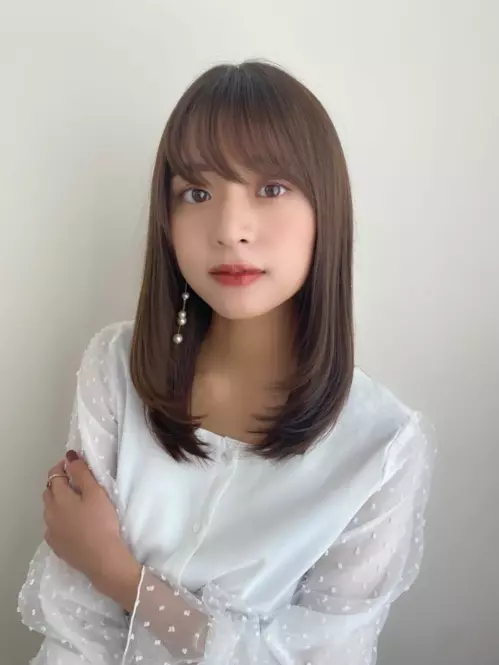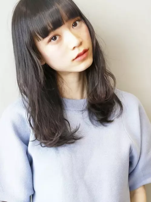 ナチュラルなセミロングスタイルに、ぱっつん前髪を合わせて印象的な目元を演出。カラーはダークグレージュで透明感をプラス。暗髪でも重たく見えません。