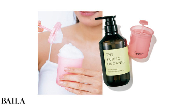 (右)洗顔用泡立て器/私物(左)99%天然由来成分配合。乾燥ダメージをメンテナンス。ザ パブリック オーガニック スーパーバウンシー ディープモイスト シャンプー 480㎖¥1580/カラーズ