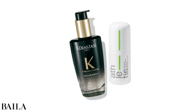 (右)10種以上の天然植物成分を配合したヘアミルク。チューニングアロマ ヘアミルク 01 100㎖ ¥3500/アスレティア(左)ダメージを補修して、まとまりやすい髪へ。ユイル クロノロジスト R 100㎖ ¥6000(美容室専売品)/ケラスターゼ