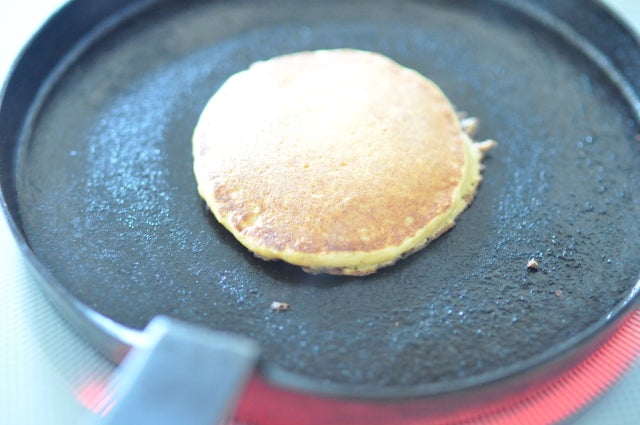 ③ 熱したフライパンにお玉で生地を流し入れます。ふつふつと穴があいてきたらひっくり返して裏面も焼きます。