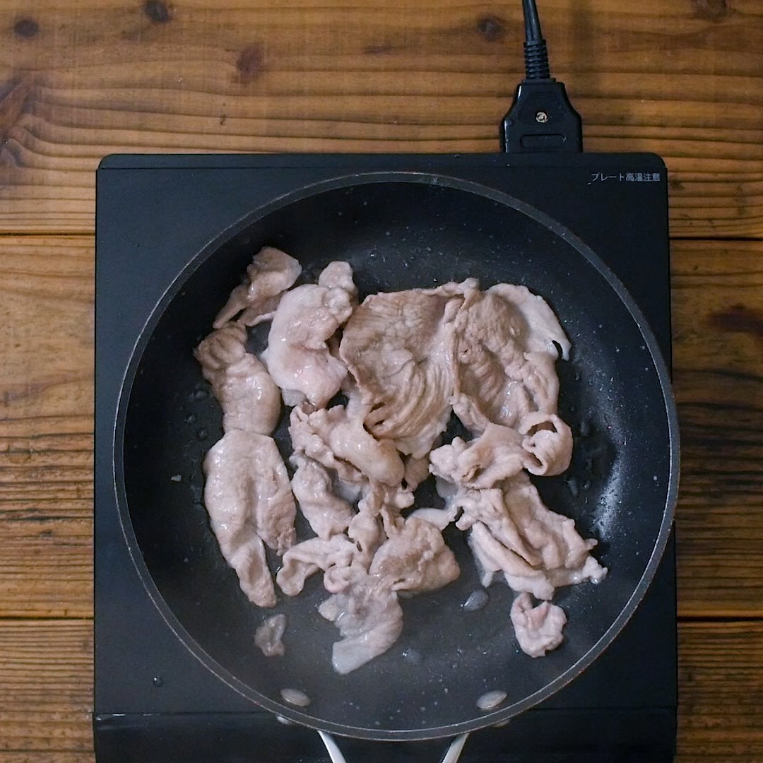 フライパンにサラダ油を引き中火で熱し、豚こま肉、砂糖を加えてを炒め、色が変わってきたら取り出します。