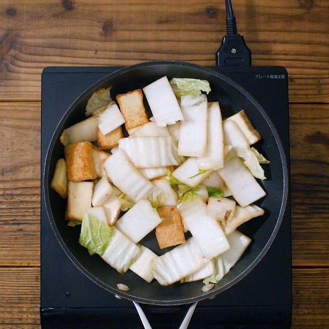 白菜の芯、厚揚げを入れてさっと炒めます。