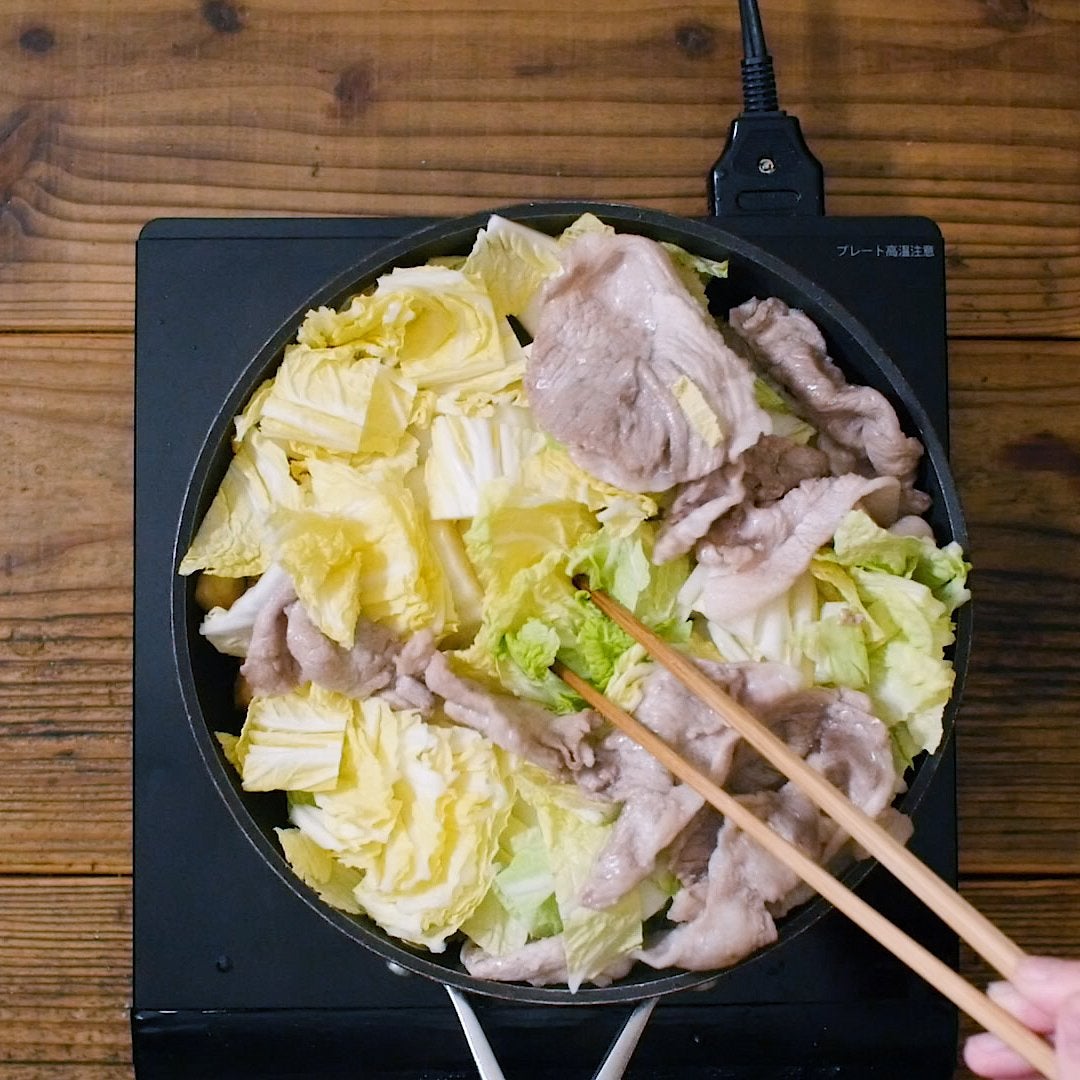 豚肉を戻し、白菜の葉を加えてさっと炒めます。