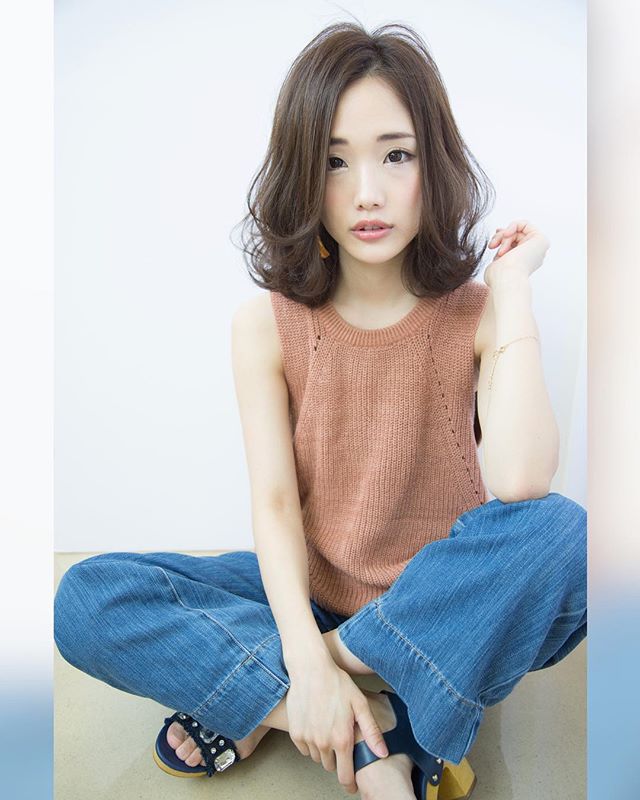この画像のようなくびれをつくったミディアムは、ぽっちゃりさんにおすすめの鉄板の小顔ヘア。