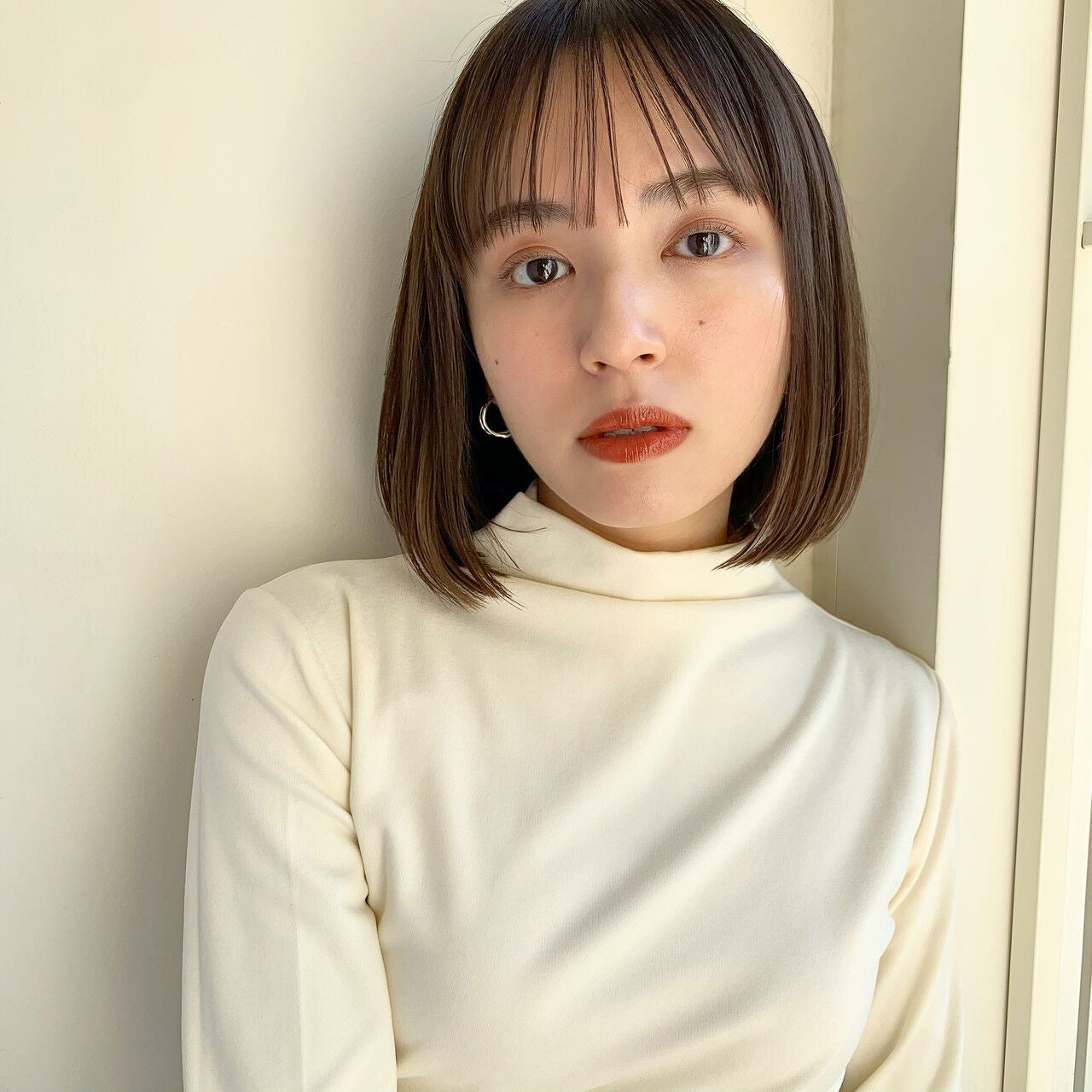 ストレートヘアのセミロングヘア。大人の落ち着きと可愛さの両方の印象を与えてくれます。毛先は重めですが、前髪をシースルーバングにすることでバランスよく抜け感を演出しています。