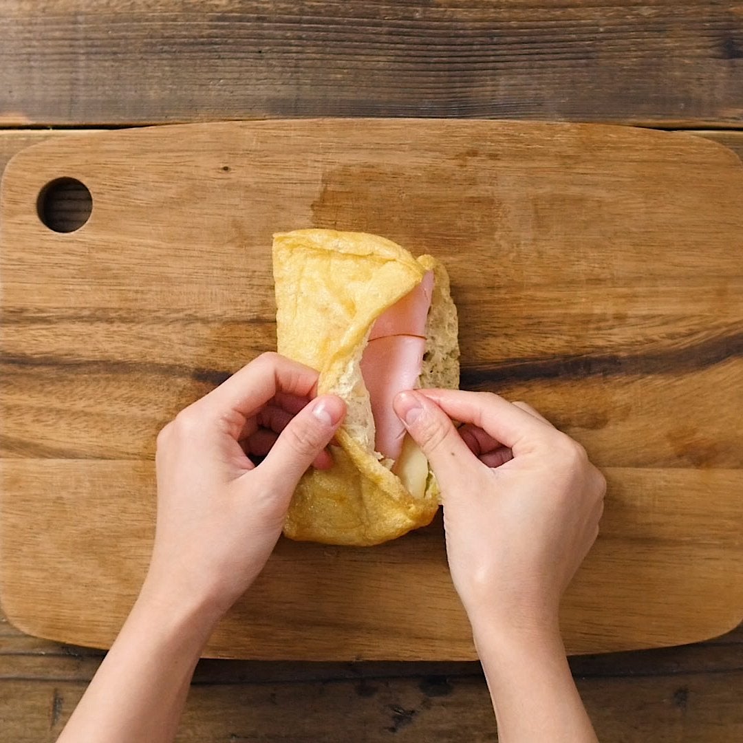 油揚げは、長い1辺に切り目を入れて開き、ハム、スライスチーズを入れます。