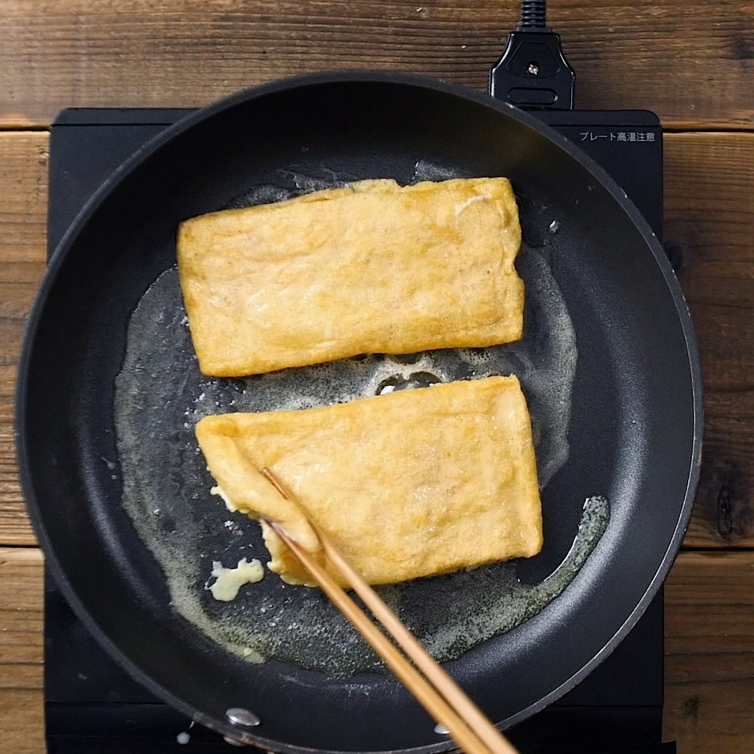 ・油揚げは油抜きし、菜箸を転がします。