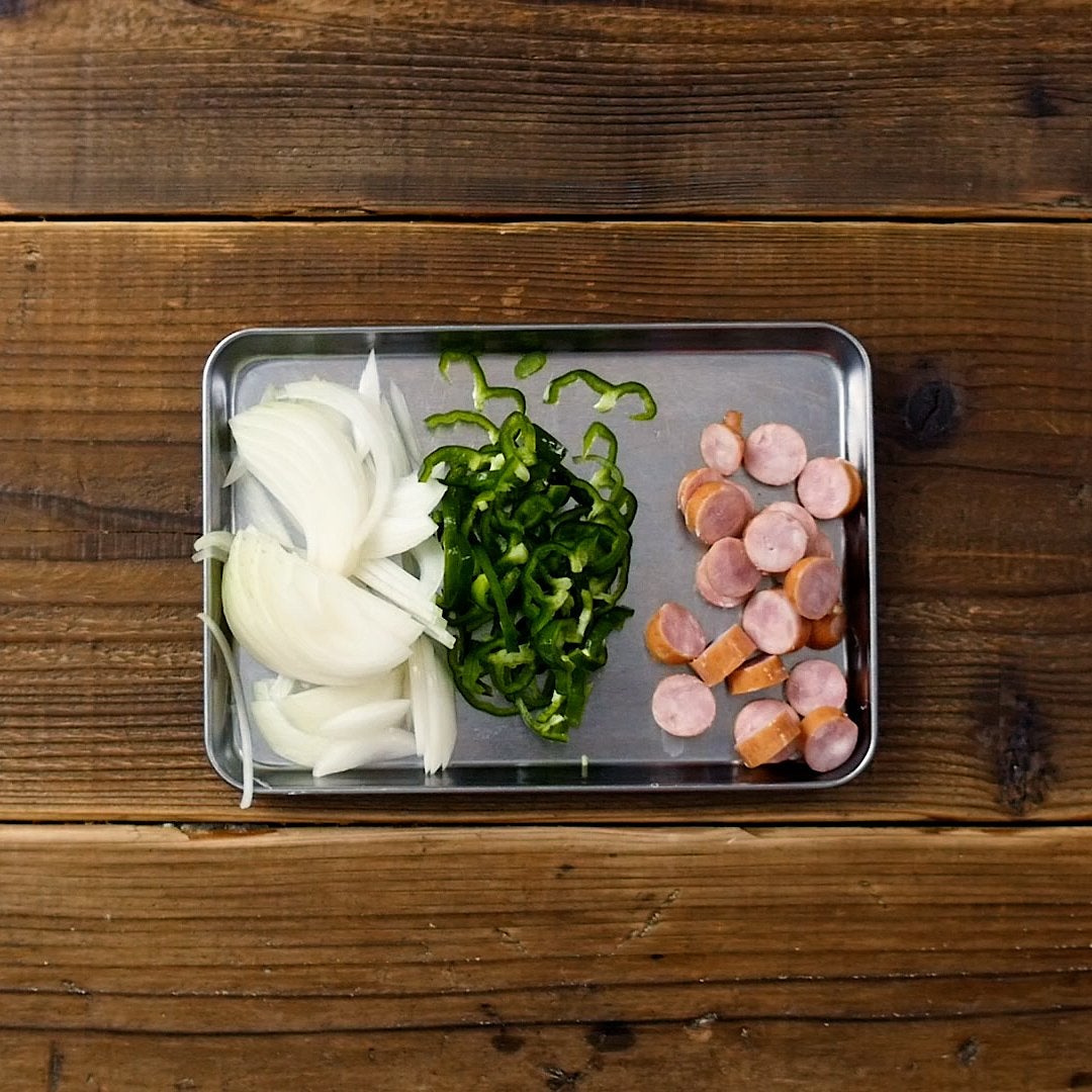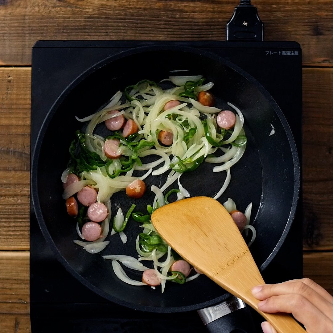 玉ねぎは薄切り、ピーマンは縦半分に切り薄切り、ウインナーは1cm幅の輪切りにします。