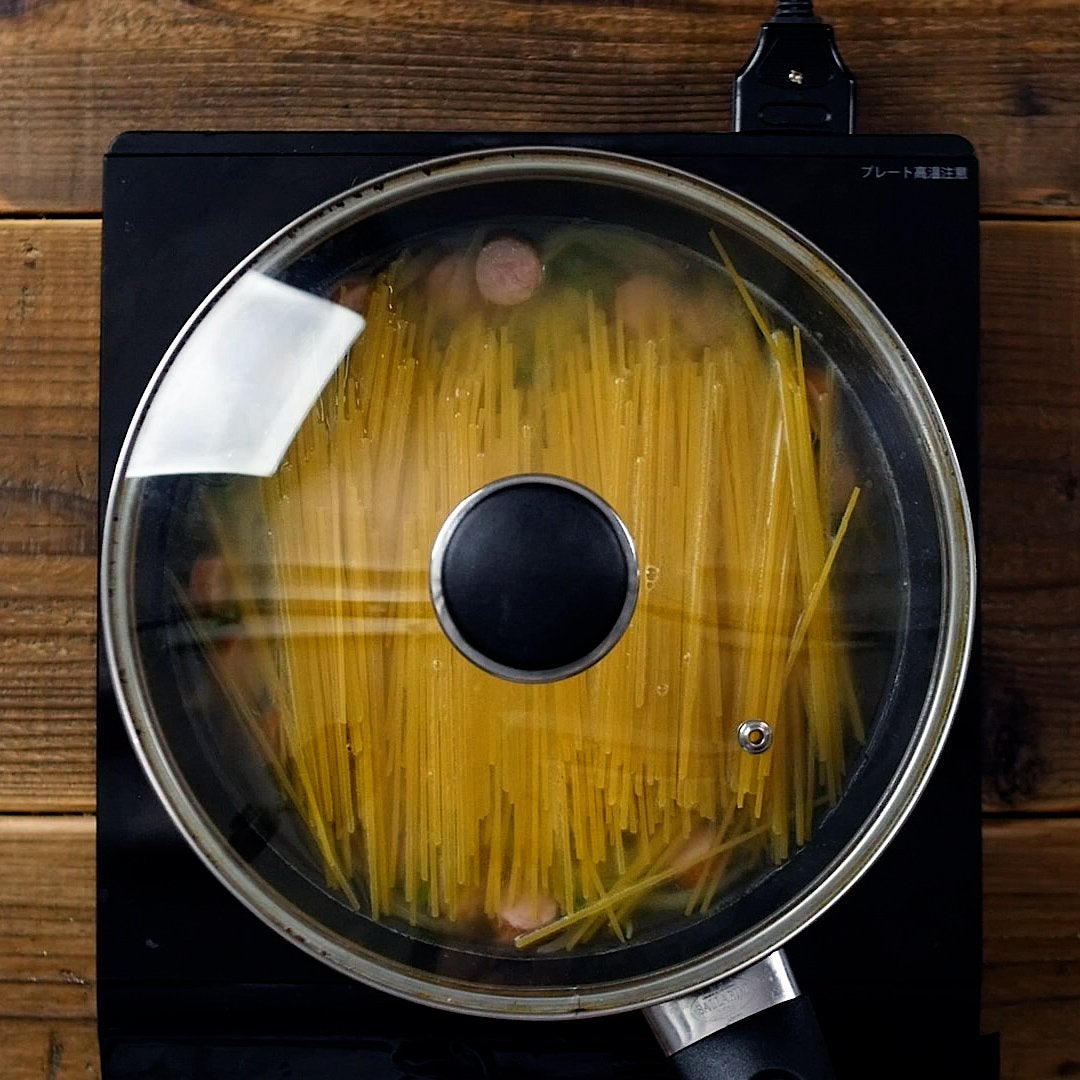 水、コンソメ、スパゲッティを半分に折って入れます。フタをし、強火で一煮立ちさせて一度かき混ぜます。